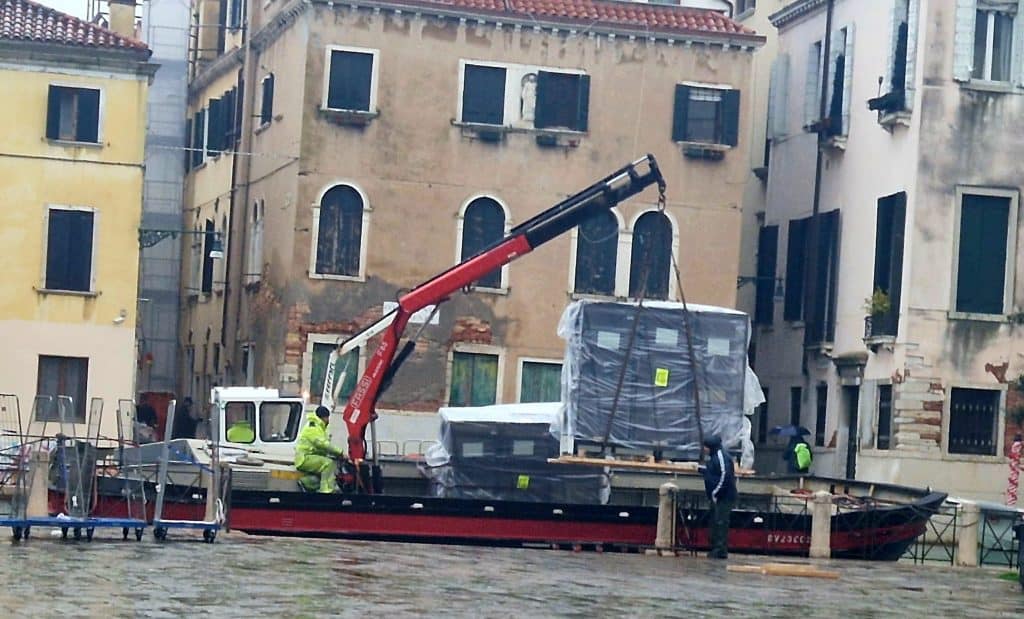 Then it is lifted, transferred, and finally moved by hand through calli and bridges that were never designed for modern loads.