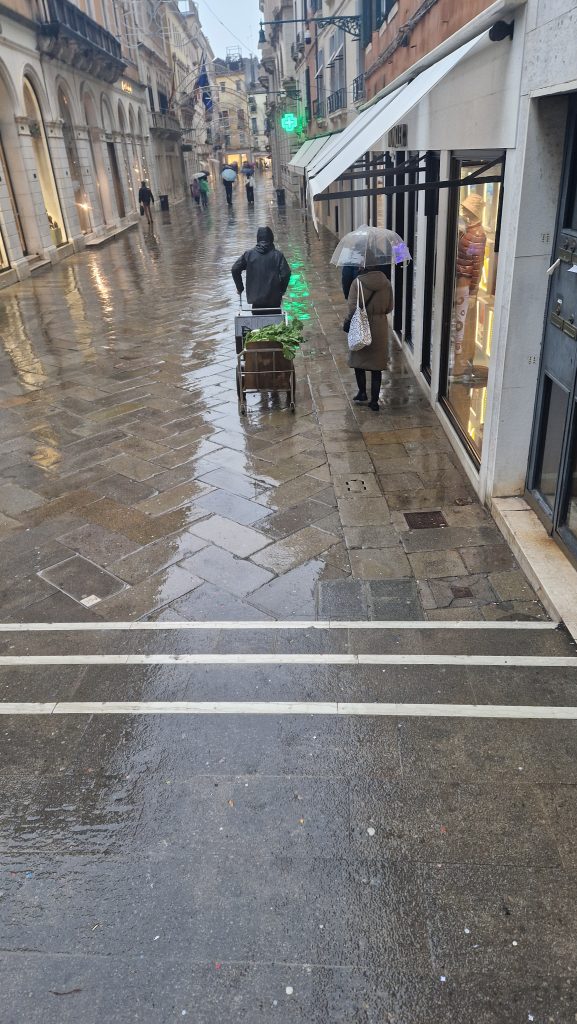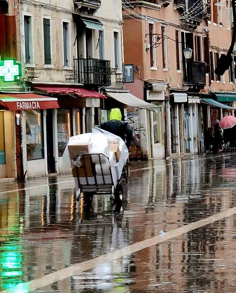 Every delivery continues by hand โ pulled on simple carts across stone pavements, through open campi and along busy pedestrian streets, also with rain, crowds and constant foot traffic.