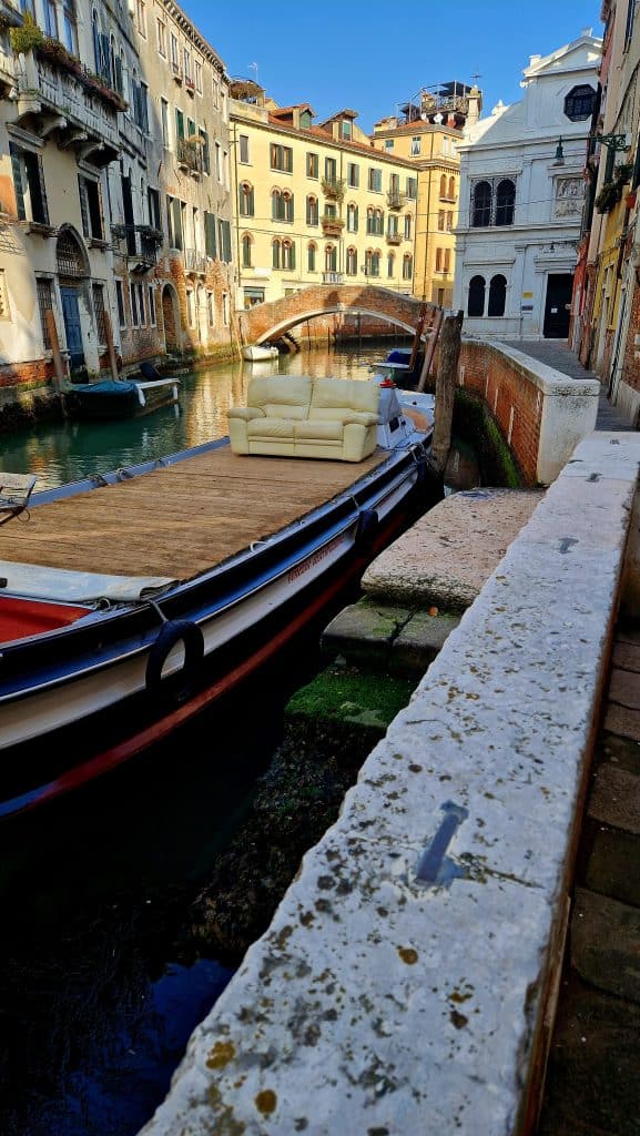A sofa transported by boat through the canals โ€” everyday logistics in a city without roads.
