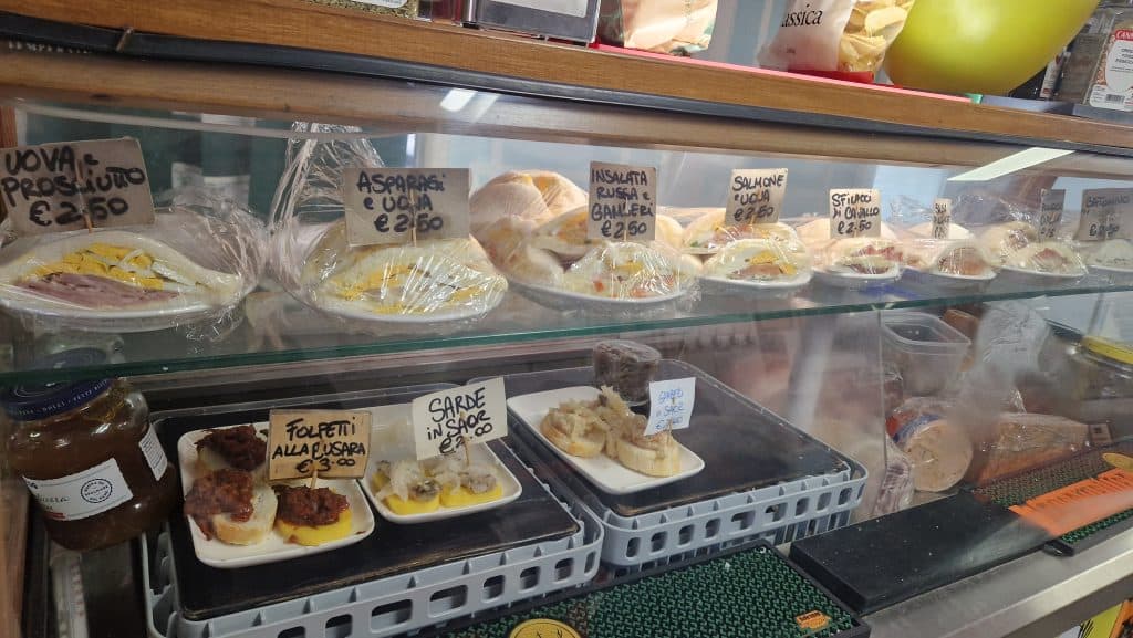 A typical Venetian bacaro display โ fresh cicchetti, polpette, tramezzini and local specialties starting from โฌ2.00. This is the real everyday food Venice locals enjoy with a glass of wine.
