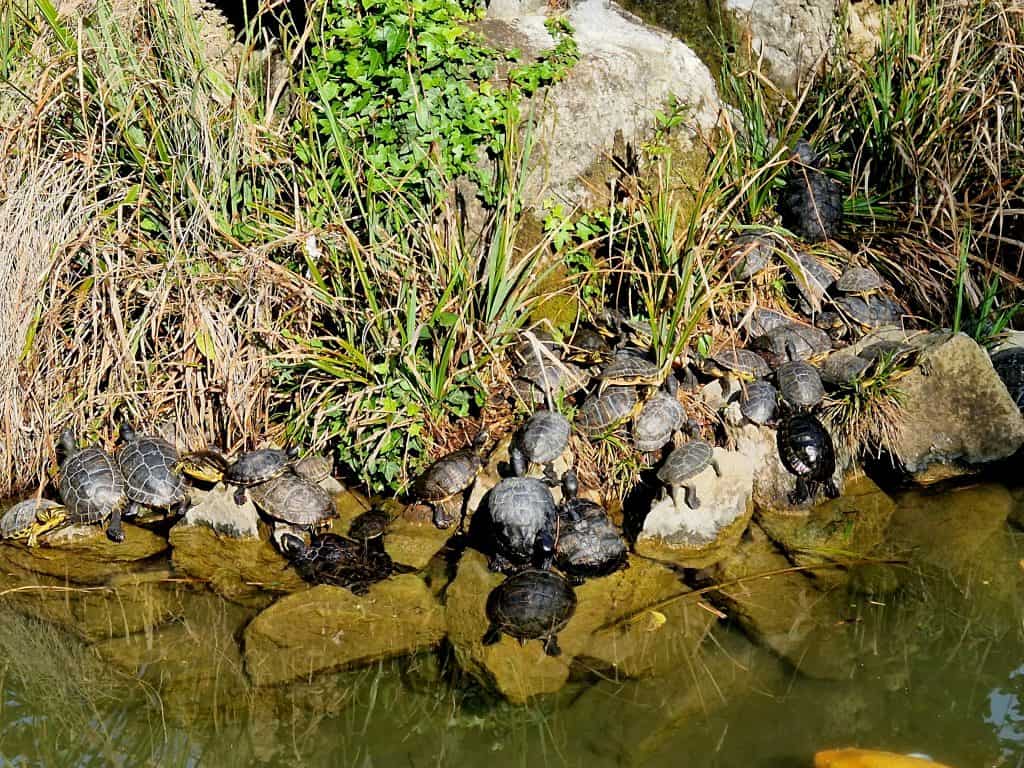Today, only a few large goldfish remain, while the turtles have become the most visible inhabitants of the water.